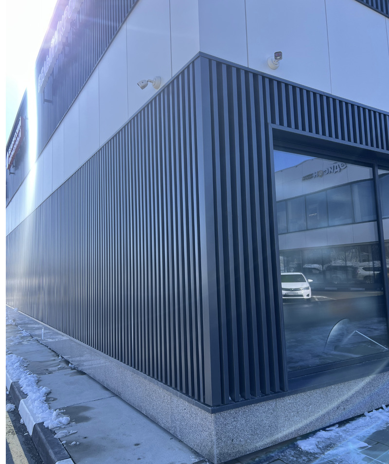 Рейка декоративная – это современный вид облицовки зданий, позволяющий создавать неповторимый внешний вид. Она представляет собой длинную панель П-образной формы (ламель) из металла, которая крепится к несущему каркасу, формируя защитный и декоративный экран здания. Рейки можно монтировать как вертикально, так и горизонтально.